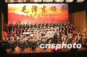 為紀念毛澤東誕辰110周年,《毛澤東頌歌大型音樂會》十二月五日晚在北京民族宮劇場舉行。中國最高級別文藝團體演出的歌唱毛澤東頌歌,讓人回憶起激情燃燒的歲月。中新社記者:史利