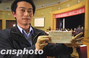 北京市政府十二日在京召開“北京市解決建設領域拖欠工程款和民工工資問題大會”,北京市建筑施工企業向外地進京勞務企業集中兌付勞務費12.6億元。南通某勞務公司代表手持現場兌付的150萬元支票高興地向記者展示。中新社記者:廖文靜