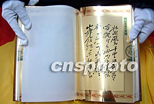 為紀念毛澤東誕辰110周年,由中央文獻出版社出版的純金版《毛澤東詩詞手跡》十六日在蘇州限量發(fā)行。金書以純度達99.9%的黃金紙為材質,詩詞集為古籍16開本,封面上鑲嵌著純金的毛澤東頭像紀念章,36頁金紙收錄了《沁園春·雪》等17幅毛澤東詩詞手跡。這部金書海內外限量發(fā)行5000套,每套定價18600元人民幣。作者:蔣振江