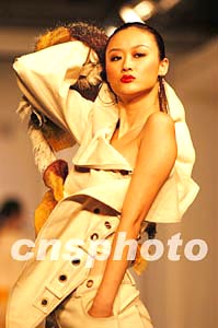 二十四日下午,在二零零三中國國際時裝周獲得大獎的幾位廣東著名服裝設計師在廣州舉辦匯報演出,展示獲獎作品中的一款別致女裝。作者:柯小軍