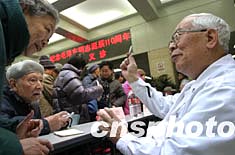 當年曾是毛主席醫療小組成員的王新德教授(右)十二月二十六日在北京醫院用為市民們義診來紀念毛主席誕辰110周年。中新社記者:史利