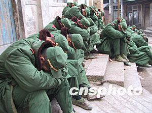 連日參加搶險疲憊不堪的武警官兵在搶險間隙小憩。作者:鄒輝
