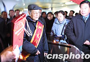北京地鐵13號線自動收費系統(簡稱AFC系統)三十一日早晨五點半正式開通,作為新系統的第一位乘客七十歲的老人洪先生身披紅色綬帶通過了地鐵自動檢票閘機口。中新社記者:廖文靜