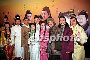 一月六日,由新加坡新動力傳媒投資拍攝的古裝神話劇《赤子成龍》在北京舉行新聞發布會。中國內地當紅演員任泉(左六)和李小璐(左五)擔綱該劇男女一號,新加坡演員李銘順(左四)、香港演員黃日華(右一)、恬妞(左一)等也加盟此劇共同演繹中國神話版的《羅密歐與朱麗葉》。作者:徐曦弋