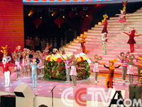 2004年春節(jié)晚會(huì)總導(dǎo)演袁德旺提出以“祝福”為春晚主題。“祝福”的主題不僅在舞美設(shè)計(jì)上得到了體現(xiàn),在晚會(huì)現(xiàn)場(chǎng)的一面墻上,還有一塊巨幅的“福”字圖。44個(gè)由不同的字體書(shū)寫(xiě)的福字環(huán)繞著中間的中央電視臺(tái)的標(biāo)志圖,祝福的主題躍然而出。