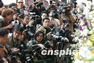 香港著名藝人梅艷芳喪禮于元月十一日設靈公祭,在香港殯儀館前大批記者報道有關梅艷芳喪禮新聞。中新社記者:錢興強