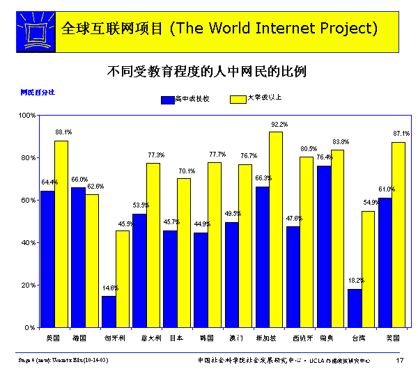 在WIP所有國家里,除德國外,有大學或以上學歷的人比高中或職業學校學歷的人更可能上網。可見,受教育程度也是影響上網的重要因素。