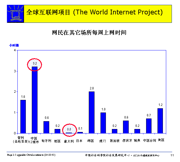 網(wǎng)民每周在家庭、辦公室或?qū)W校之外的場所(在發(fā)達(dá)國家,有可能是在圖書館,而一般國家則更可能是在網(wǎng)吧)上網(wǎng)的平均時(shí)間多者可達(dá)3.2小時(shí)(中國),少則幾乎為零(意大利)。