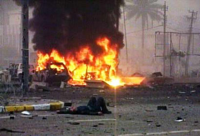 在爆炸產生的濃煙當中,士兵們將受傷的伊拉克人從地上扶起來。聯軍軍方發言人表示:“我們認為當時發生了汽車爆炸事件。”