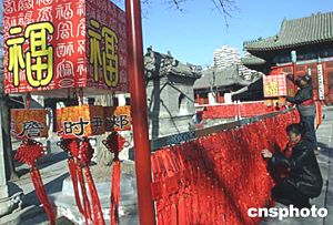 猴年春節在即,第三屆北京民俗文化節暨第六屆東岳廟文化廟會一月二十日即將在著名的東岳廟舉辦。十九日工作人員正在加緊布置“福”路,迎接祥和興旺的新春。中新社記者:張勤