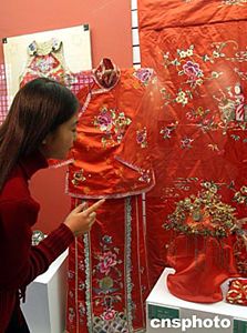 著名的東岳廟一月二十一日至二十八日將舉辦第三屆北京民俗文化節暨第六屆東岳廟會,正在布置中的古典婚慶服裝營造了熱烈的節日氣氛。中新社記者:張勤