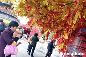 春節將至,上海龍華寺門前的一棵許愿樹吸引了不少市民,眾多路人紛紛駐足在許愿樹前為新年祈福。中新社記者:湯彥俊