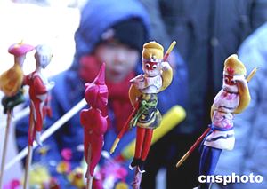 “孫悟空面人”在首屆北京兒童廟會上向小朋友招手致敬。中新社記者:武仲林