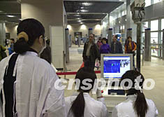 澳門新關閘邊檢大樓二日開始啟用,新的出入境大廳使用了許多先進的設備,圖為入境大廳使用的測溫設備在入境人員不留意間已經將體溫測出。中新社記者:李剛