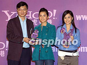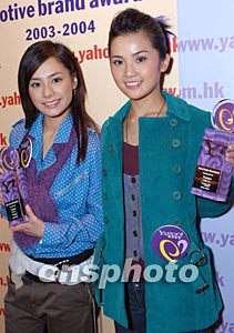 人氣組合Twins兩名成員鐘欣桐(右)、蔡卓妍2月5日在香港出席《Yahoo!感情品牌大獎2003-2004》頒獎典禮,Twins二人分別為「松日MP3」及化妝品牌「~H2O+」代言獲獎,雅虎香港總經理蔡寶德先生頒發兩個「感情品牌代言人」獎項予Twins二人。作者:鄧慶樂