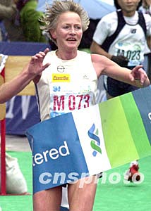 “渣打馬拉松2004”二月八日在香港舉行,來自丹麥的選手卡妤爾奪得該賽公開組女子冠軍。圖為卡妤爾在終點沖刺。 作者:錢興強