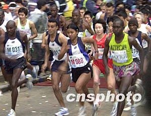 “渣打馬拉松2004”二月八日在香港舉行,超過二萬四千名香港及海外參賽者冒雨角逐。 作者:錢興強