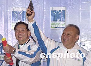 “渣打馬拉松2004”二月八日在香港舉行,香港特別行政區行政長官董建華、渣打銀行大中華區總裁王冬勝在起跑儀式上為馬拉松主持鳴槍禮。 作者:錢興強