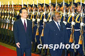 中國國務(wù)院總理溫家寶二月九日在北京人民大會(huì)堂主持歡迎儀式,歡迎來訪的巴布亞新幾內(nèi)亞總理索馬雷。中新社記者:毛建軍