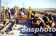 二月九日,京廣線鄭州段雙橋車站正在安裝目前中國國內最先進的鐵路提速道岔。列車通過此道岔的時速將由過去的四十公里提高到八十公里,并且沒有咔嚓聲。作者:慎重