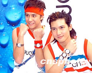 樂壇組合Boy'Z兩名成員關智斌(Kenny)、張致恒(Steven)(左)2月12日在香港出席品牌SWATCH 2004春夏腕表系列發布會,兩人并為SWATCH展示新系列腕表。作者:鄧慶樂
