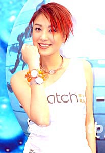 歌星鄭希怡2月12日在香港出席品牌SWATCH 2004春夏腕表系列發布會,鄭希怡為SWATCH展示新系列腕表。作者:鄧慶樂