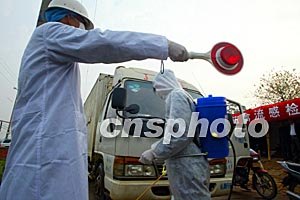 記者今天隨國務院新聞辦組織的中外記者團前往南寧興寧區疑似禽流感疫區采訪,汽車行駛十分鐘后,速度忽然減慢,記者看到,在進入興寧區的一個路口,六位身穿隔離服,背著噴霧器的工作人員正仔細地為進出的每一輛車進行消毒。