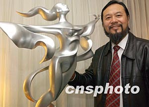 為紀念諾曼底登陸六十周年,應法國諾曼底政府的邀請,由中國著名藝術家遙遠先生創作的巨型雕塑作品《世界和平女神》,將于2004年6月6日紀念諾曼底登陸六十周年活動期間聳立在法國諾曼底登陸的中心位置。圖為近日遙遠先生在香港向傳媒介紹他的雕塑作品《世界和平女神》(模型)的藝術創作過程及感想。作者:錢興強