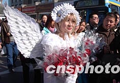 二月十四日情人節,一名打扮成天使模樣的女青年在北京鬧市兜售玫瑰花。盡管情人節玫瑰花旺銷,但賣花者大增,使得競爭加劇,加上玫瑰花價格不菲,所以零售生意并不好做。中新社記者:張煒