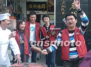 三月九日,以“鴛鴦蝴蝶夢”走紅的臺灣娛樂界名人黃安在福州澳門路與百年老鋪“同利肉燕店”陳君凡先生一起表演打燕皮的絕活,令在場觀眾樂翻了天。黃安此行是應福建東南電視臺之邀錄制娛樂節目的。作者:鄭祚聲