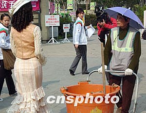 日前,在香港維多利亞公園一位頭戴別致遮陽帽的環(huán)保員工,與身穿華麗服飾的港姐迎面而過,兩人不同的服飾顯得各具風采。作者:錢興強
