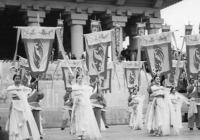 56面黃色儀仗旗在陽光下獵獵飄揚,有“太常”旗、“黃麾”旗,還有龍旗、門旗、日月旗、五星旗、風雨旗、雷云旗、五岳旗、二十八宿旗和猛獸猛禽旗等,還有兵仗8對。最引人注目的是龍頭桿頂上高3米、寬兩米的“太常”旗,旗面上繪有青色日月星辰、升龍降龍和祥云波濤。這是最高級別的儀仗旗。