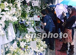 四月一日是一代歌星張國榮逝世一周年忌日,香港及海外眾多歌迷手捧鮮花冒雨來到文華酒店前,以不同方式表達對歌星張國榮的深切懷念。中新社記者:錢興強