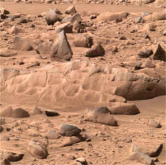 勇氣號今年1月3日登陸火星Gusev環形山,科學家認為這里曾經是一個湖泊。現在,勇氣號正在向著一個丘陵區挺進,在那兒,可能會有證明火星曾是一個濕潤星球的地質證據,包括一些由液態水沖刷而形成的沉積巖。