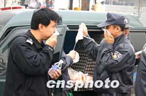 四月十七日,在重慶市天原化工總廠附近待命的警察正在領取口罩。十五日晚,該廠發(fā)生氯氣泄漏事故,有十五萬人撤離。作者:鄒輝