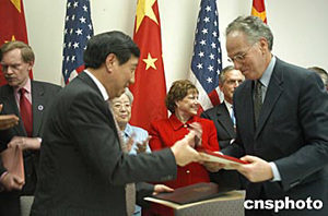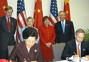 中美在四月二十一日結束的第十五屆中美商貿聯委會上,就“高技術出口最終用戶訪問”達成協議,這將推動美國對華高科技出口。圖為中國商務部副部長馬秀紅(左)與美國商務部副部長杰斯特(右)在簽字。作者:余東暉