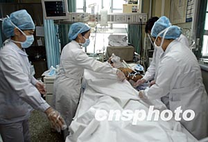 四月二十三日,北京大學人民醫院重癥監護室(ICU)的醫生護士在護理外科手術后的患者。北京市新確診的一例SARS疑似患者,四月十四日轉入該院后一直在遠離這里的呼吸科監護室治療。中新社記者:任晨鳴