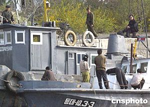 朝鮮士兵在與中國丹東隔鴨綠江相望的朝鮮碼頭執勤。中新社記者:宋吉河
