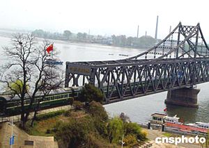 中國丹東一列通往朝鮮平壤的客運火車,四二十五日上午通過鴨綠江上的中朝友誼大橋出關開往平壤。中新社記者:宋吉河