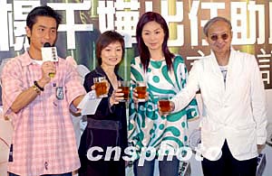 歌影紅星楊千嬅4月27日在香港正式簽約成為瘦身產品《助助身茶》代言人,助助茶氣有限公司高層(左二)與楊千嬅及其經理人黃柏高(右)以《助助身茶》代酒慶祝,順道宣傳產品。作者:鄧慶樂