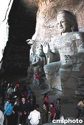 5月8日,游人們在世界文化遺產(chǎn)山西省大同云岡石窟群前游玩。石窟群里雕刻精美的佛像、巧奪天宮的木制建筑和美輪美奐的壁畫,一直吸引著世界各地的游客前來觀光。作者:陳帆
