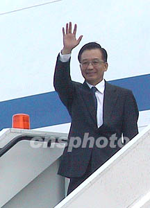 中新社倫敦五月九日電 (記者 朱大強)當地時間今天上午十時五十分,中國國務院總理溫家寶乘專機抵達倫敦希思羅機場,開始對英國進行為期三天的正式訪問。