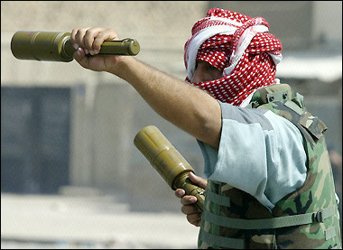 據法新社報道 在巴格達什葉派社區薩德爾城,一名效忠于什葉派宗教領袖薩德爾的民兵正拿著兩個拄型手榴彈站在薩德官邸附近。(固山)