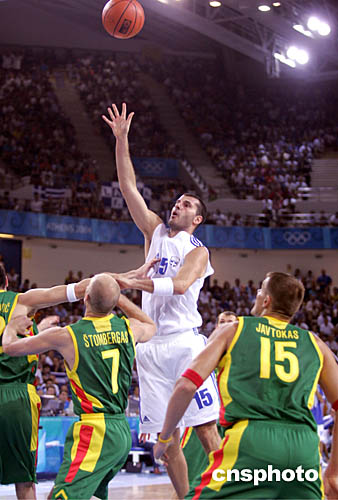 在當地時間8月19日舉行的希臘與立陶宛的籃球比賽中,立陶宛15號選手Robertas JAVTOKAS高高跳起為搶籃板。