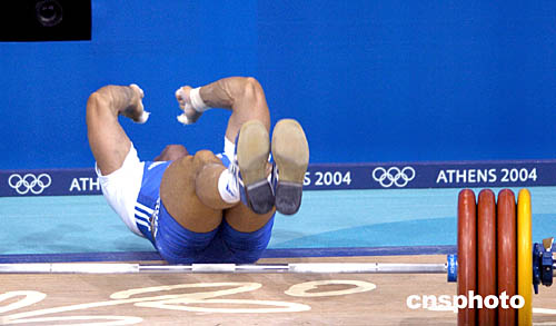在當地時間8月19日舉行的男子77公斤級比賽中,希臘選手維·米特魯試舉失敗后人也仰倒在地。