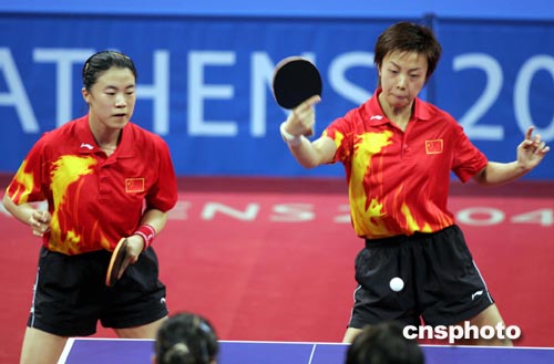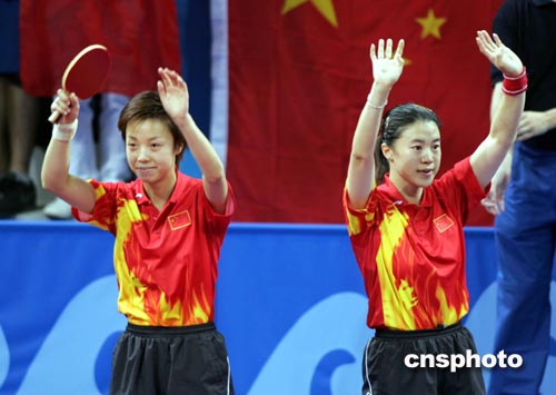 當(dāng)?shù)貢r(shí)間8月20日下午,中國乒乓球選手王楠、張怡寧在決賽中以4比0輕取韓國選手,獲得本屆奧運(yùn)會(huì)女子雙打冠軍。中新社記者:任晨鳴