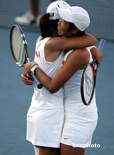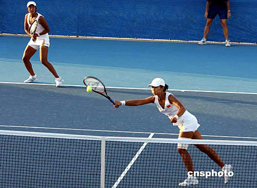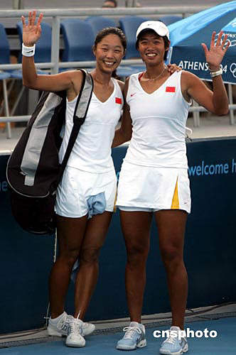 雅典當(dāng)?shù)貢r間8月20日傍晚,中國網(wǎng)球選手孫甜甜、李婷(前)在半決賽中以九比七戰(zhàn)勝阿根廷選手,歷史性地闖入奧運會女子網(wǎng)球雙打決賽。中新社記者:任晨鳴