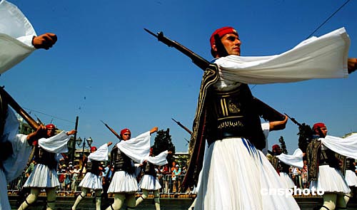 在雅典無名戰士紀念碑前站崗的希臘王家衛隊衛兵,身著當年爭取民族獨立戰爭時期山區戰士的裝束。成為一名王家衛隊衛兵是很多希臘青年的夢想。中新社記者:王瑤