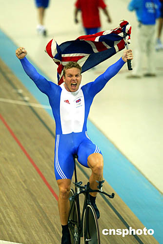 圖為在當地時間8月20日舉行的男子自行車1公里計時賽決賽后,奪冠的英國選手豪伊(Chris Hoy)高舉國旗歡呼勝利的場面。