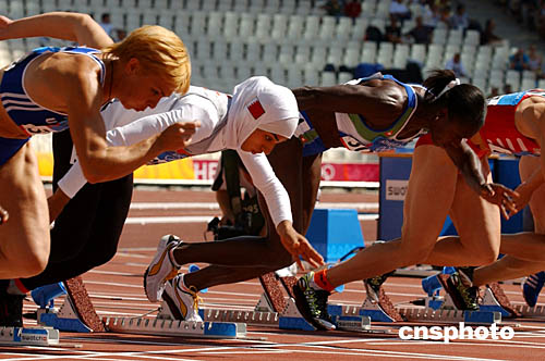 圖為在當?shù)貢r間8月20日舉行的女子100米比賽中,巴林選手Rakia Al Gassra包著頭巾穿著長袖長褲與別的選手形成鮮明對比。